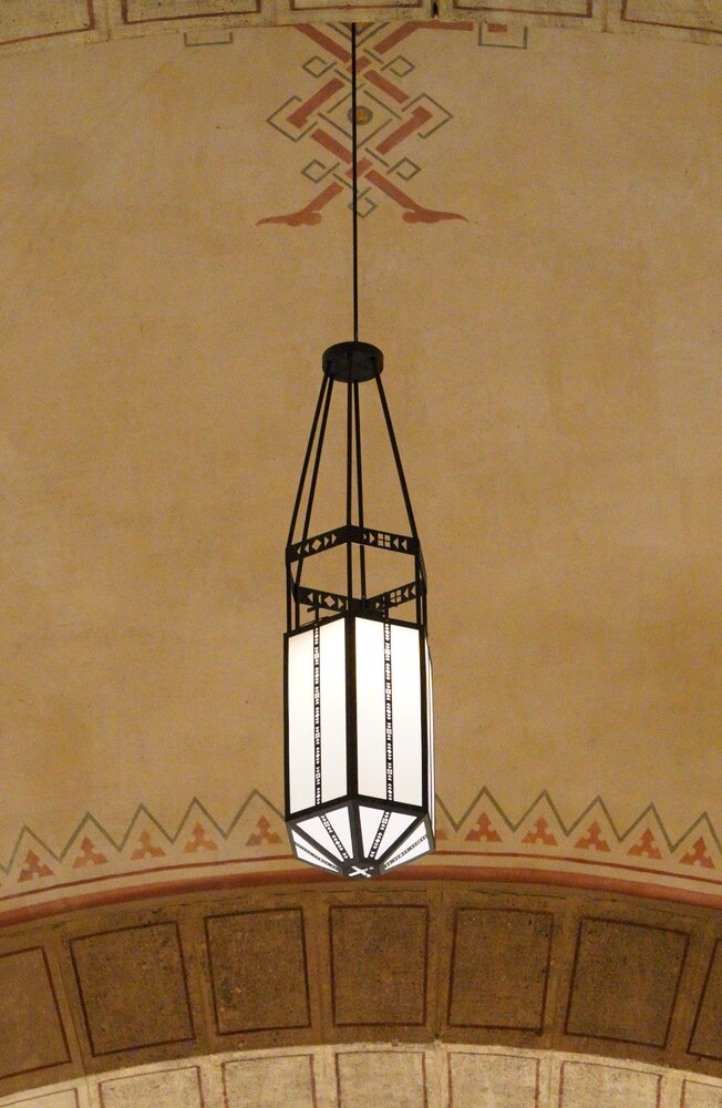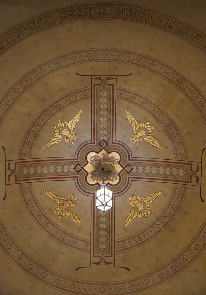 Le décor des murs est exécuté à partir de 1882 à la peinture à l’huile, directement sur la pierre, par Henri Compan (1841-1912). Les formes géométriques stylisées, dessinées au pochoir, servent à mettre en valeur et à animer les différents éléments architecturaux.