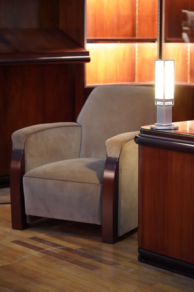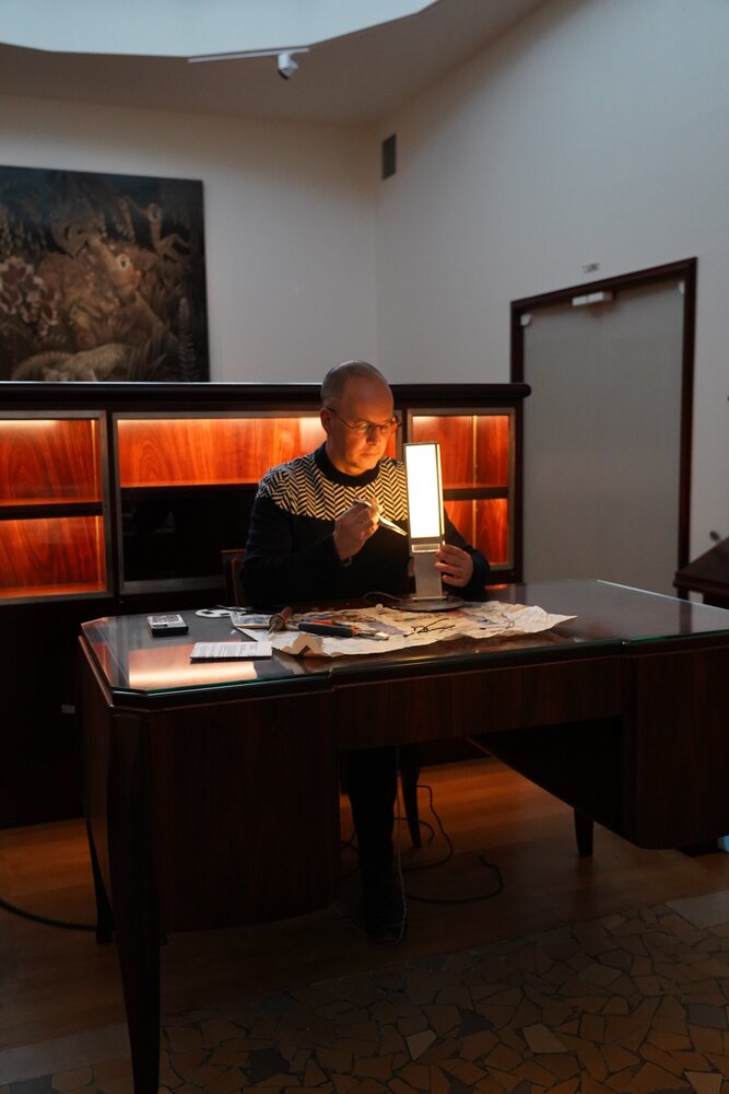 Les esquisses de Raphaël Armand ont découlé de ces nombreuses heures de recherches, d’interprétations et de connaissances des codes architecturaux de l’époque. La scénographie parfaite du visiteur réside avec les points de lumière stratégiques qui lui racontent une histoire au cours de son voyage. Au total, sur les vingts luminaires et lampes proposés, 2 types ont été retenus. Une lampe de bureau ainsi que les appliques murales que l’on peut voir sur les clichés ainsi qu’une applique également présente sur les photos.
