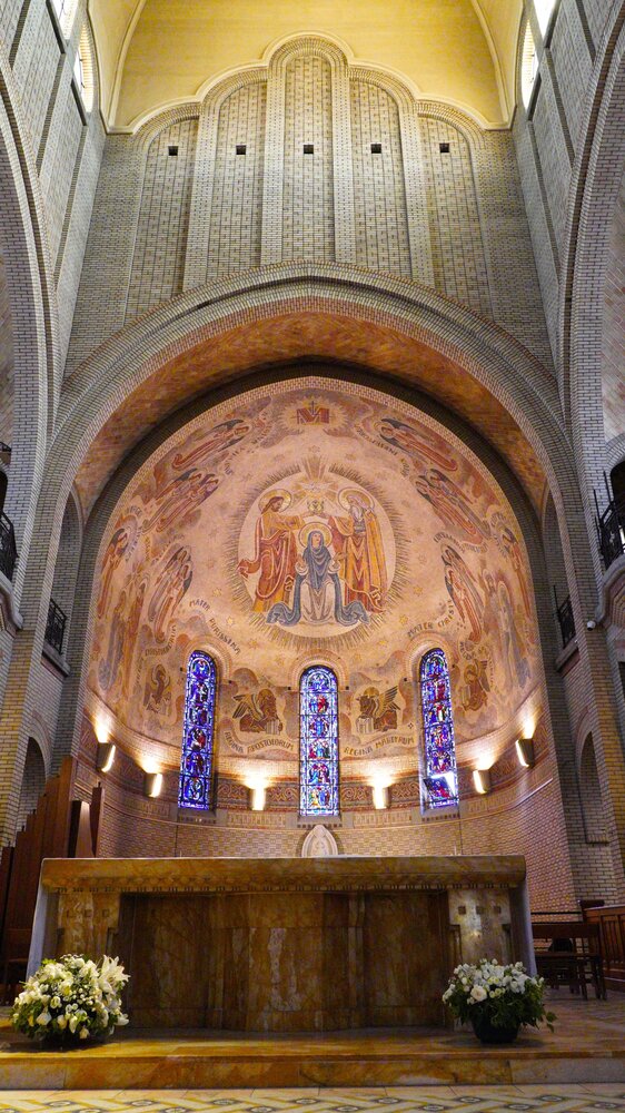 L’architecte utilise le béton armé et le ciment et l’ensemble recouvert de briques polychromes. Des chapelles ornées de statues d’Henri Bouchard (1875-1960) et des mosaïques imposantes.